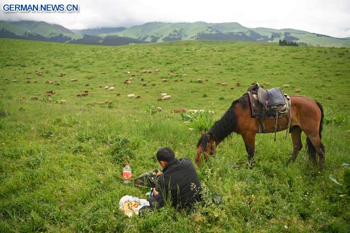 Xinjiang ist mit seinen üppigen Weiden eine der wichtigen Viehzuchtregionen Chinas. Das Ili-Flusstal an den Nordhängen des Tianshan-Gebirges verfügt über reichhaltige Weideressourcen. Jedes Jahr im Juni treiben die lokalen Hirten ihr Vieh auf höher gelegene Sommerweiden, wo es Gras im Überfluss gibt.