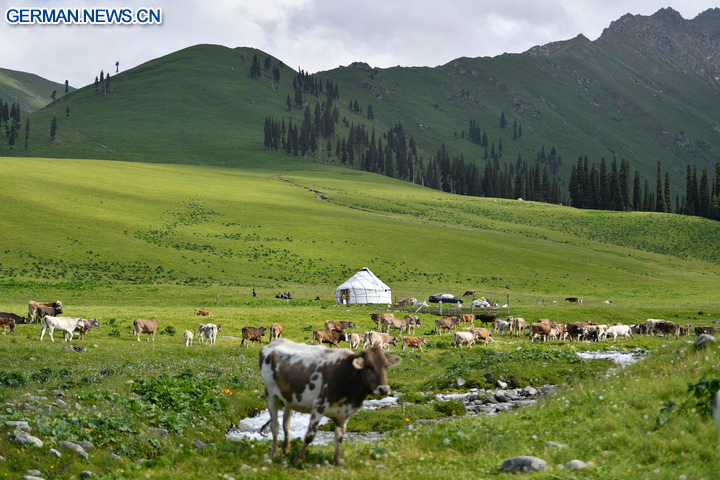 Das Foto zeigt die Sommerweide, auf der die Familie von Balatijan Eremubai bleiben wird, im Kreis Xinyuan im Uigurischen Autonomen Gebiet Xinjiang im Nordwesten Chinas, 11. Juni 2025. (Xinhua/Hu Huhu)