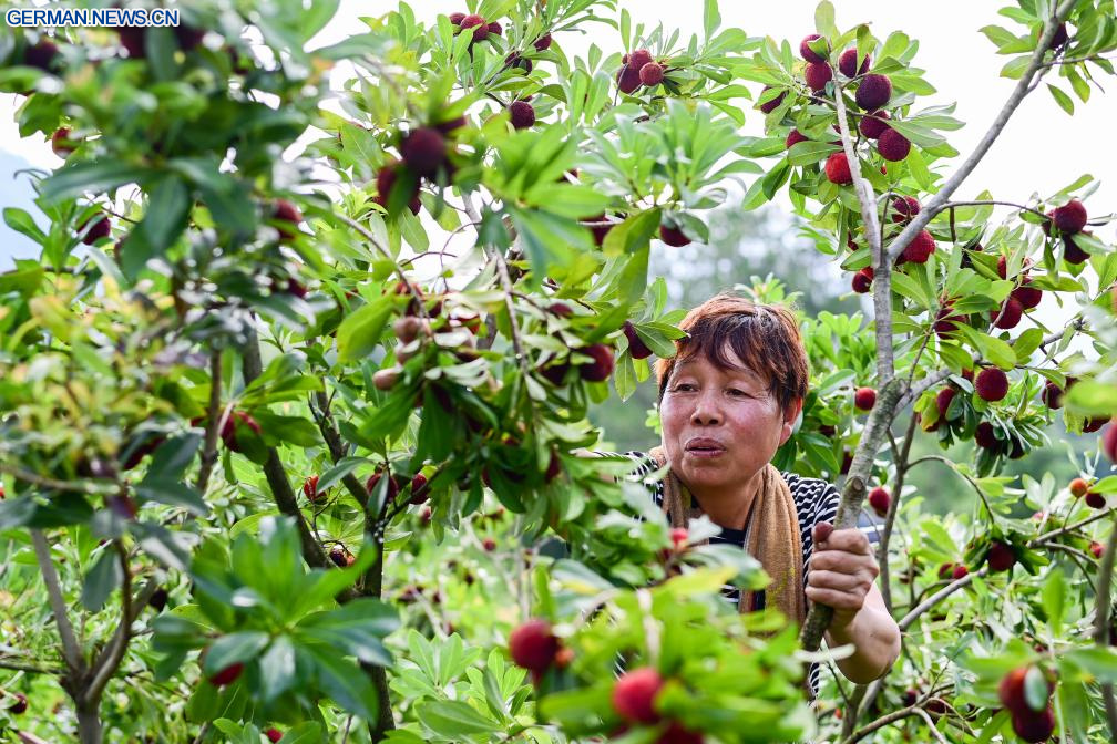 Eine Landwirtin erntet Dongkui-Wachsbeeren in einer Obstplantage im Kreis Wencheng in der ostchinesischen Provinz Zhejiang, 23. Juni 2025. (Quelle: Xinhua/Jiang Han)