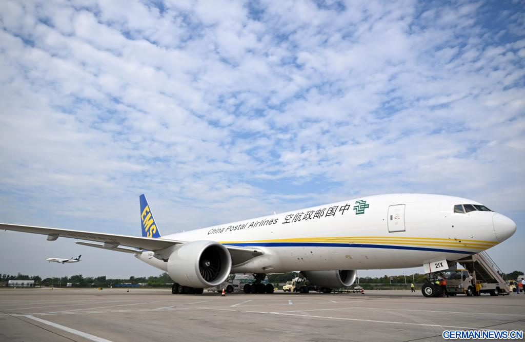 Ein Frachtflugzeug der China Postal Airlines von Zhengzhou (China) nach Luxemburg ist vor seinem Jungfernflug auf dem Rollfeld des internationalen Flughafens Zhengzhou Xinzheng in der zentralchinesischen Provinz Henan abgebildet, 23. Juni 2025. (Quelle: Xinhua/Li Jianan)