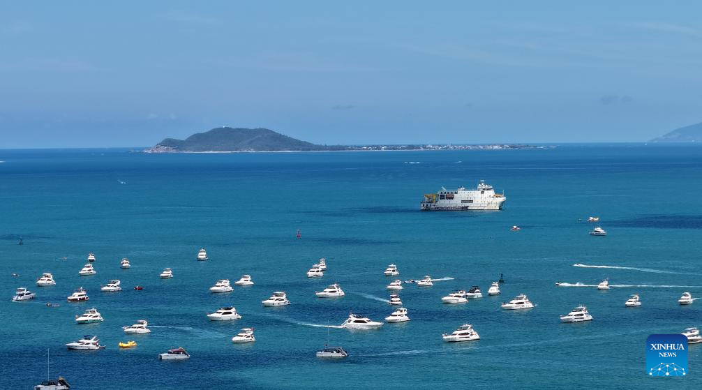 Zahlreiche Yachten gleiten über das Wasser der Sanya-Bucht in der südchinesischen Provinz Hainan (Drohnenaufnahme vom 24. Juni, Zhao Yingquan/Xinhua).