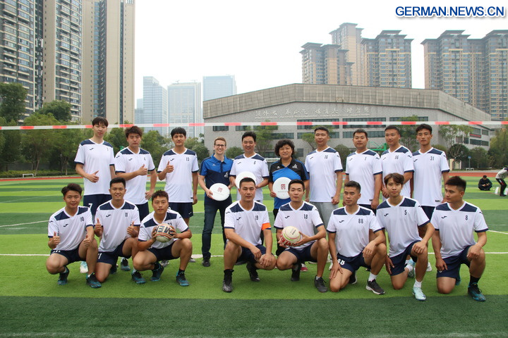 Mitglieder einer Faustballmannschaft posieren für ein Gruppenfoto mit Sönke Spille (vierter von links, hinten), Verantwortlicher für Veranstaltungen der International Fistball Association (IFA), in Chengdu in der Provinz Sichuan im Südwesten Chinas, 24. Oktober 2024. (Xinhua)
