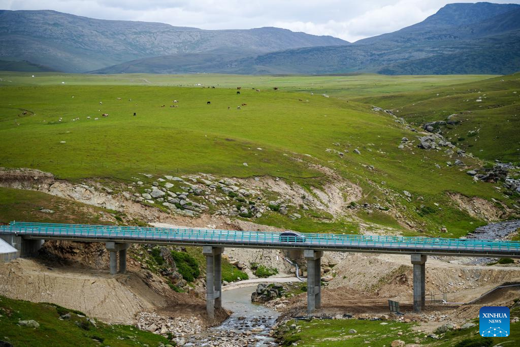 Ein Fahrzeug auf der Altay-Hemu-Autobahn in Xinjiang. (Foto vom 30. Juni 2025, Xinhua/Xu Hongyan)