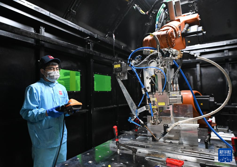 Ein Mitarbeiter der Guangdong Lyric Robot Automation Co., Ltd. in Huizhou in der Provinz Guangdong stellt Parameter für das Laserdrahtschweißen ein. (Foto vom 27. Juni 2025, Xinhua/Deng Hua)