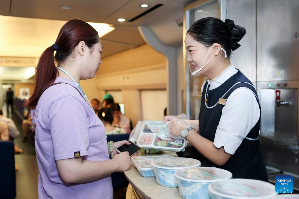 Eine Zugbegleiterin erklärt einem weiblichen Fahrgast das Speiseangebot während der Fahrt. (Foto vom 1. Juli 2025, Wang Xiang/Xinhua)