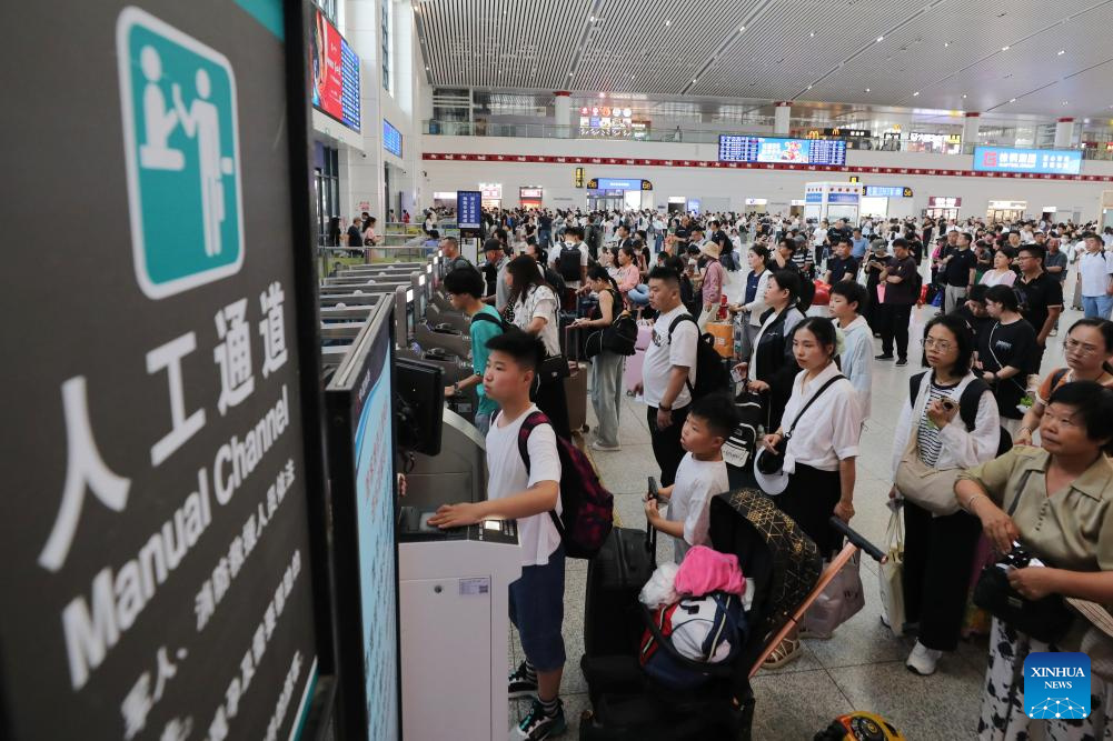 Passagiere beim Check-in im Bahnhof Xuzhou Ost in der ostchinesischen Provinz Jiangsu. (Foto vom 1. Juli 2025, Mao Jun/Xinhua)