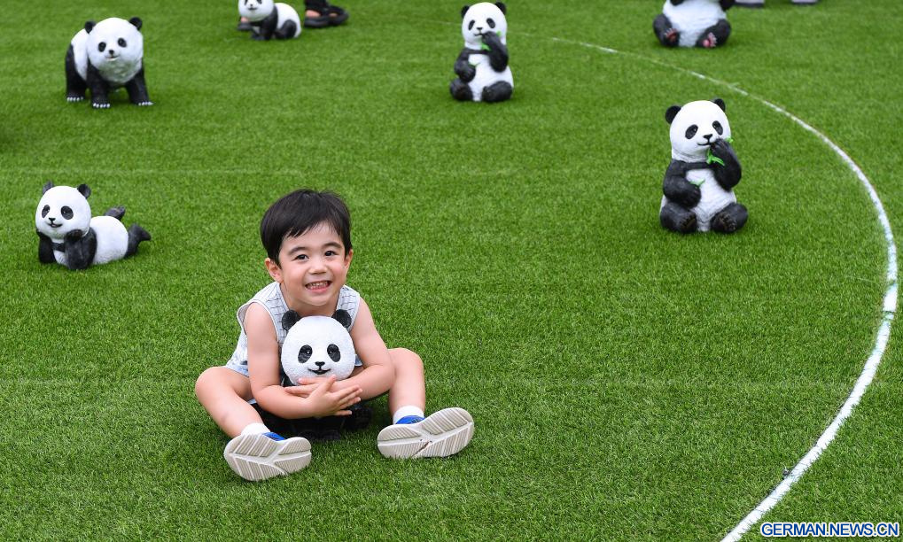 Ein Kind posiert für Fotos mit Panda-Dekorationen bei einer feierlichen Veranstaltung im Victoria Park in Hongkong, Südchina, 1. Juli 2025. (Quelle: Xinhua/Chen Duo)