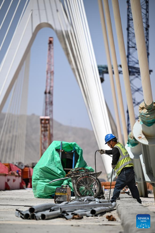 Ein Bauarbeiter auf der Baustelle der Großbrücke über die Heishan-Schlucht des Gelben Flusses. (Foto vom 3. Juli 2025, Xinhua/Feng Kaihua)