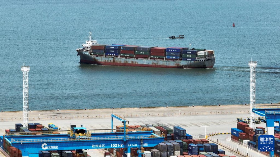 Ein Containerschiff verlässt den Hafen von Qinzhou. (Foto von Zhang Ailin/ Xinhua)