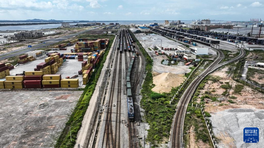 Ein Zug voller Container verlässt den Bahnhof Qinzhou Ost. (Foto von Zhang Ailin/ Xinhua)