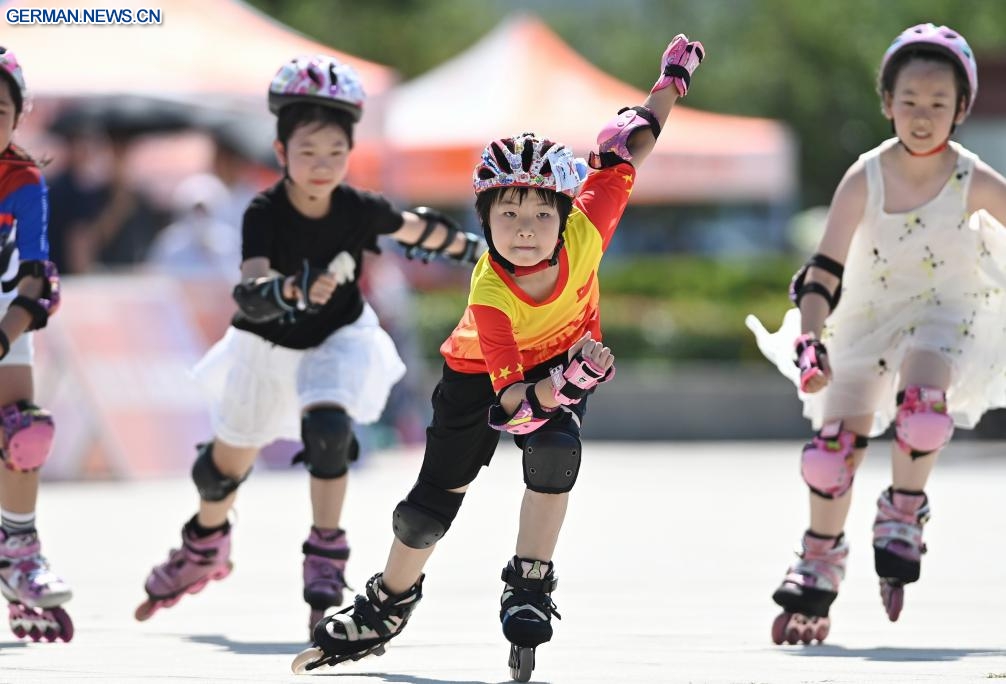 Kinder nehmen an einem Rollschuhwettbewerb in der Stadt Zaozhuang in der ostchinesischen Provinz Shandong teil, 5. Juli 2025. (Foto von Li Zhijun/Xinhua)