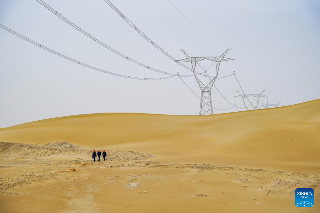 Wartungspersonal kontrolliert die 750-kV-Stromleitungen rund um das Tarim-Becken im Kreis Yuli. (Foto vom 27. April 2024, Xinhua/Xu Hongyan)