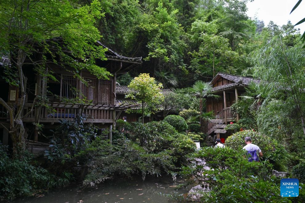 Touristen besuchen die Landschaftszone Taohuayuan im Kreis Youyang in der südwestchinesischen Stadt Chongqing. (5. Juli 2025, Xinhua)
