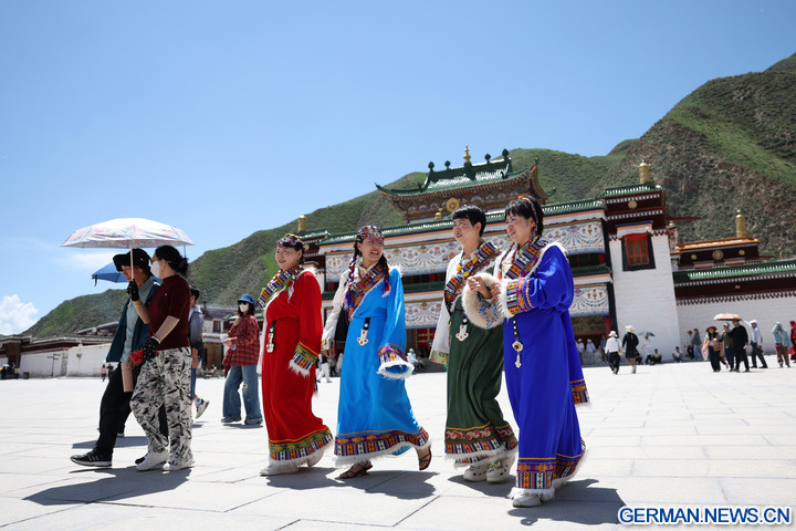 Touristen besuchen das Labrang-Kloster im Kreis Xiahe der tibetischen Autonomen Präfektur Gannan in der Provinz Gansu im Nordwesten Chinas, 10. Juli 2025. (Xinhua/Chen Bin)