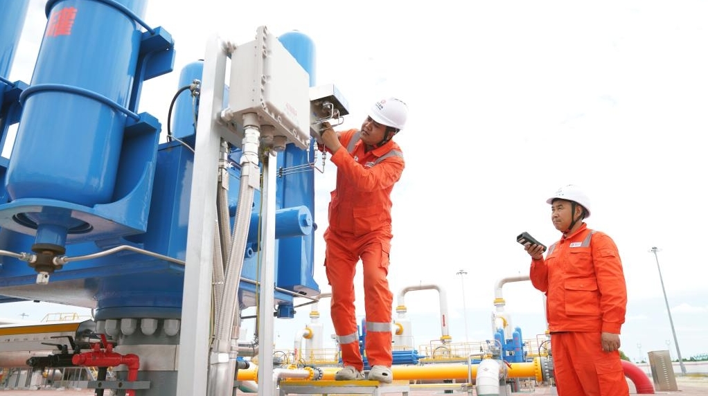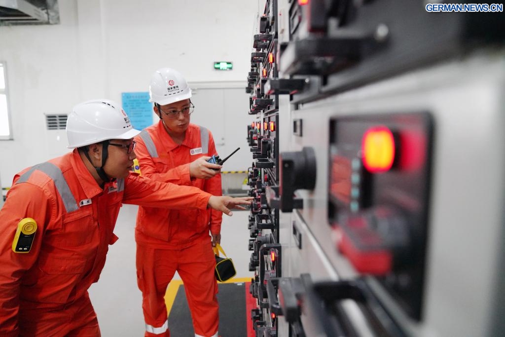 Arbeiter warten eine Anlage an einer Gasfernleitungsstation in Heihe in der nordostchinesischen Provinz Heilongjiang, 9. Juli 2025. Mit Stand 10. Juli hat das gesamte Gastransportvolumen des chinesischen Abschnitts der Erdgaspipeline zwischen China und Russland auf der Ostroute 100 Milliarden Kubikmeter überschritten. Der chinesische Abschnitt der Pipeline beginnt in Heihe, einer Stadt im Nordosten des Landes an der Grenze zu Russland, und transportiert Erdgas von Sibirien bis nach Shanghai, Chinas Wirtschafts- und Finanzzentrum. (Quelle: Xinhua/Wang Song)