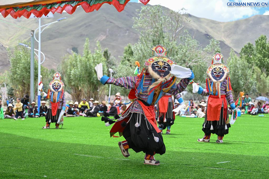 Schauspieler einer Truppe für tibetische Oper treten in einem Park im Kreis Namling der Stadt Xigaze im Autonomen Gebiet Xizang im Südwesten Chinas auf, 16. Juli 2025. (Quelle: Xinhua/Li Xin)