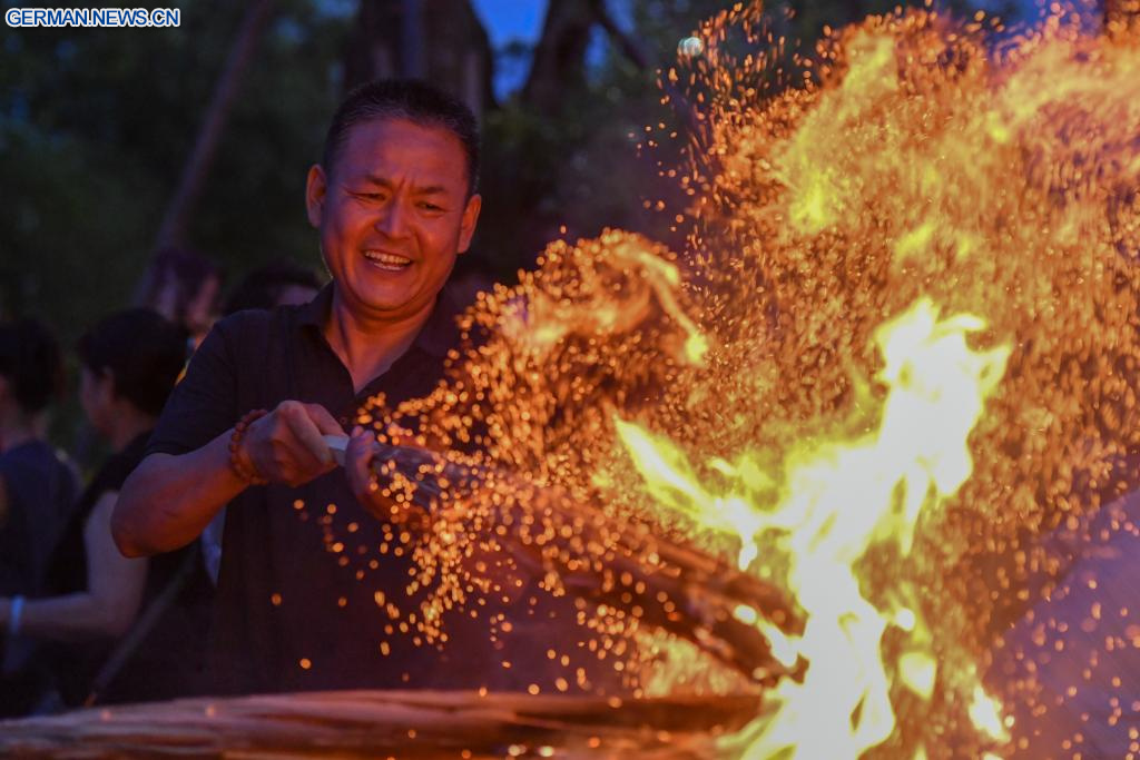 Ein Tourist zündet eine Fackel bei einem Fackelfest im Autonomen Kreis Weishan der Yi und Hui in der Autonomen Präfektur Dali der Bai in der südwestchinesischen Provinz Yunnan an, 19. Juli 2025. (Quelle: Xinhua/Peng Yikai)