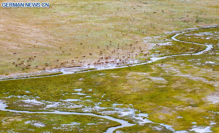 Dank wirksamer Schutzmaßnahmen ist die Zahl der Tibetantilopen in Xizang nach Angaben der regionalen Abteilung für Ökologie und Umwelt auf mehr als 300.000 Tiere gestiegen. (Xinhua/Jiang Fan)