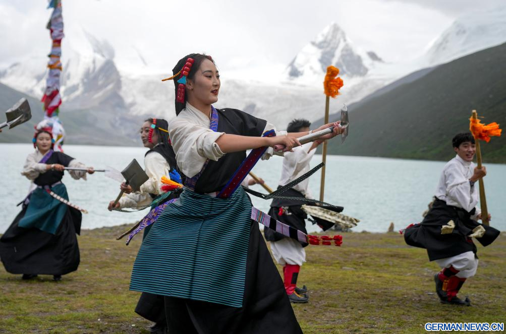 Traditioneller Dakpo-Axie-Tanz im Landschaftsgebiet in Chinas Xizang aufgeführt