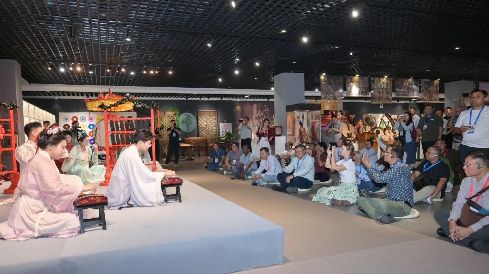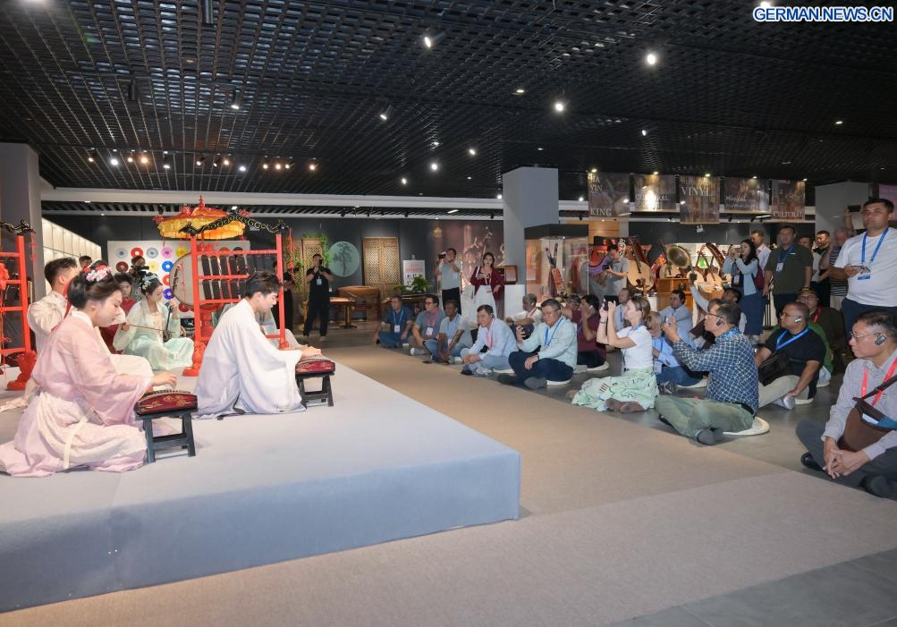 Die Teilnehmer des Shanghai Cooperation Organization (SCO) Media and Think Tank Summit schauen sich eine Aufführung traditioneller chinesischer Musikinstrumente in Kaifeng in der zentralchinesischen Provinz Henan an, 26. Juli 2025. Der SCO Media and Think Tank Summit findet vom 23. bis 27. Juli in Zhengzhou statt. Die Teilnehmer sind eingeladen, während des Gipfels verschiedene Orte in Henan zu besuchen. (Quelle: Xinhua/Gao Jie)