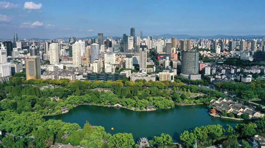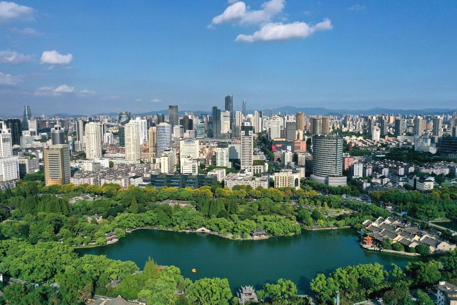 Eine Drohnenaufnahme vom 5. September 2024 zeigt den Yuehu-Park und die Skyline der Stadt Ningbo in der ostchinesischen Provinz Zhejiang. (Xinhua)