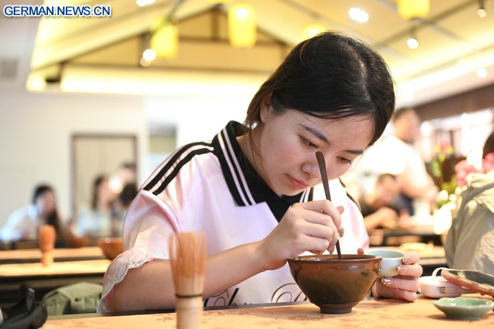 Eine Touristin versucht sich in traditionellen chinesischen Techniken der Teezubereitung im Dorf Jingshan im Bezirk Yuhang der Stadt Hangzhou in der Provinz Zhejiang in Ostchina, 5. August 2025. (Xinhua/Mao Zhu)