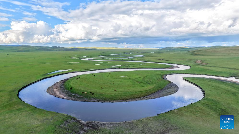 In der nordchinesischen Autonomen Region Inneren Mongolei fließt der Mo’ergele-Fluss durch die weite Steppe Hulun Buir. Die Sommerlandschaft entlang des Flusses ist atemberaubend schön. (Foto vom 19. August 2025, Ma Jinrui/Xinhua)