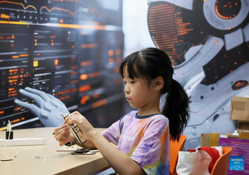Ein Mädchen montiert eine Fernbedienung für ein Spielzeugschiff in einer Wissenschafts- und Technologieausbildungsinstitution in Shanghai. (Foto vom 21. August 2025, Fang Zhe/Xinhua)