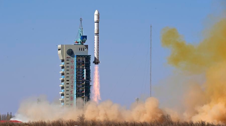 Eine Trägerrakete startet mit einem Testsatelliten für Satelliteninternettechnologie an Bord vom Satellitenstartzentrum Jiuquan ins All. (1. April 2025, Xinhua)