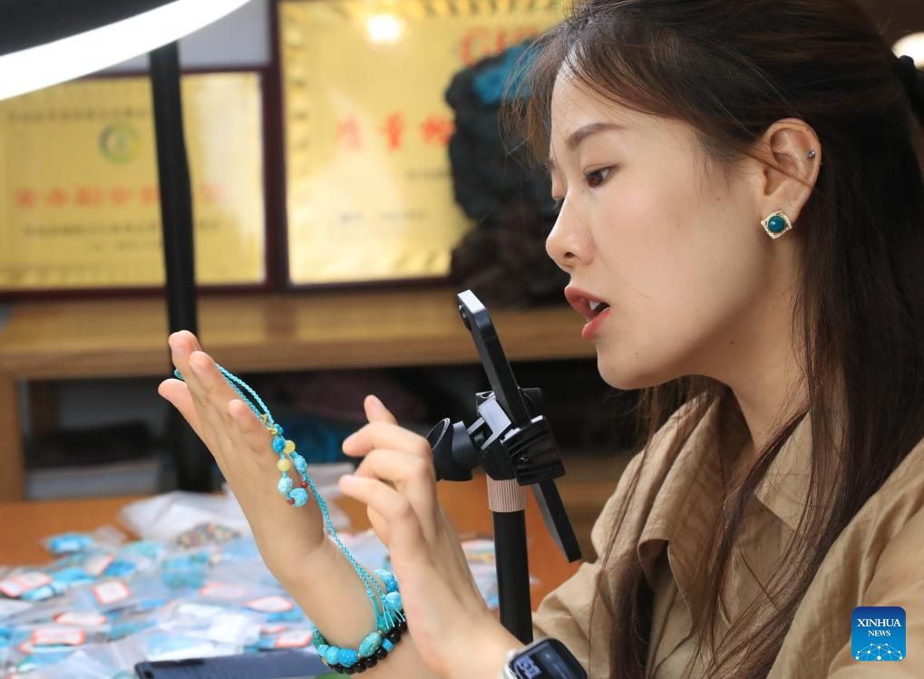 Eine Mitarbeiterin verkauft Türkisstein-Schnitzereien per Livestreaming im Kreis Zhushan. (30. August 2025,Xinhua)