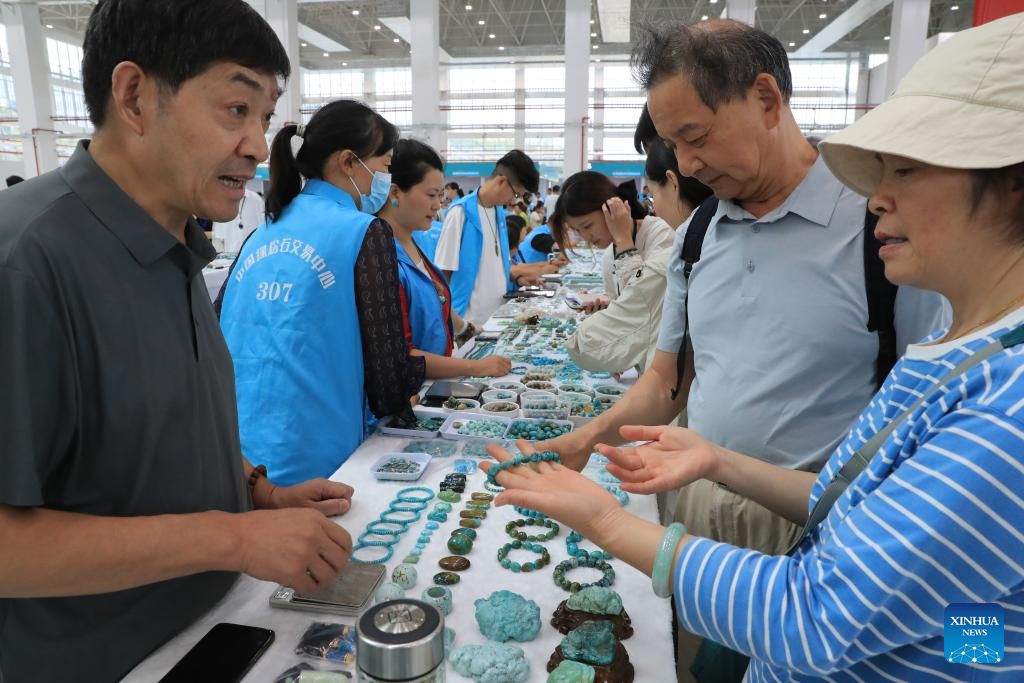 Kunden wählen handgefertigte Türkisstein-Schnitzereien in Zhushan aus. (30. August 2025,Xinhua)