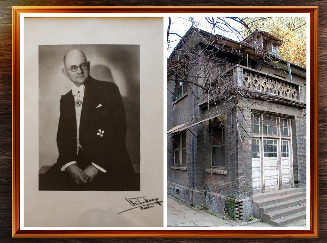 Links: Foto von John Rabe (1938); Rechts: John Rabes ehemaliges Wohnhaus auf dem Campus der Nanjing-Universität (Aufnahme Dezember 2005).