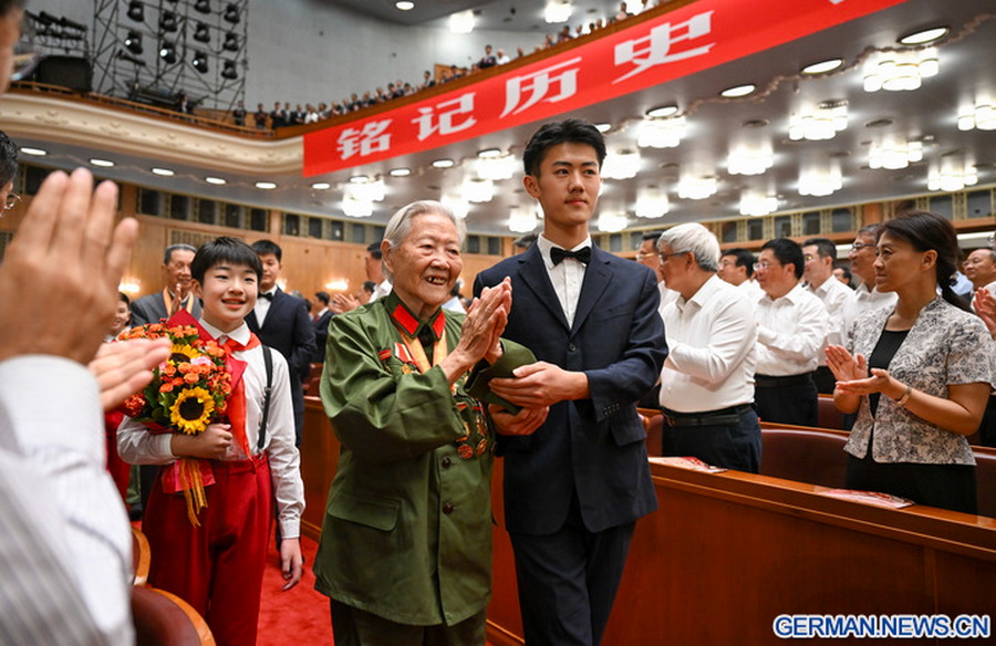 Kriegsveteranen werden mit herzlichem Applaus vor einer großen Kultur-Gala in der Großen Halle des Volkes in der chinesischen Hauptstadt Beijing empfangen, 3. September 2025. Die große Kultur-Gala mit dem Thema „Gerechtigkeit siegt“ wurde in Beijing zum Gedenken an den 80. Jahrestag des Sieges im Widerstandskrieg des chinesischen Volkes gegen die japanische Aggression und im weltweiten antifaschistischen Krieg veranstaltet. (Xinhua/Xie Huanchi)