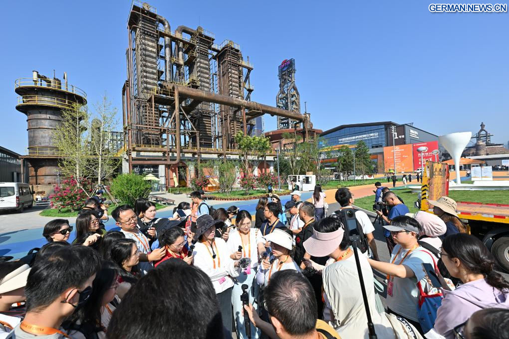 Medienfachleute arbeiten im Shougang-Park, dem Veranstaltungsort der bevorstehenden China International Fair for Trade in Services (CIFTIS) in Chinas Hauptstadt Beijing, 9. September 2025. (Quelle: Xinhua/Li Xin)