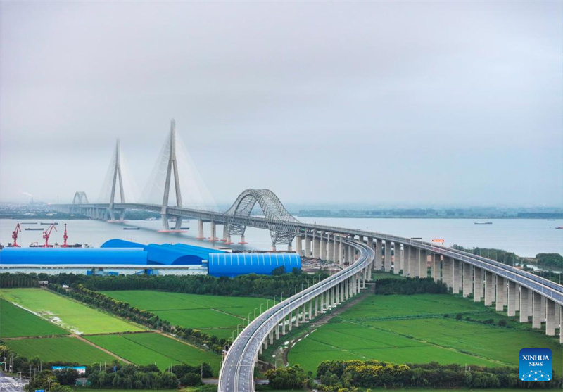 Die Changtai-Jangtse-Brücke am 9. September 2025 von der Stadt Taixing in Taizhou in der ostchinesischen Provinz Jiangsu aus gesehen. (Foto: Gu Jihong/Xinhua)