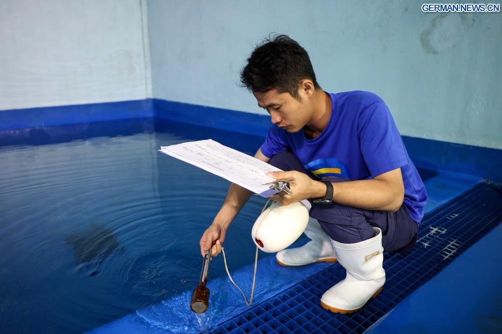 Ein Mitarbeiter misst die Wassertemperatur im Blue Ocean Conservation and Rescue Center in Lingshui in der südchinesischen Provinz Hainan, 8. September 2025. Eine Robbe namens Anong, die dafür bekannt ist, mit lokalen Fischern an einem unerschlossenen Strand in der Gemeinde Dongjiao der Stadt Wenchang in der Provinz Hainan zu interagieren, wurde zum Schutz und zur späteren Rückkehr in die Wildnis in ein Zentrum für den Schutz von Wasserwildtieren in Lingshui überführt. (Quelle: Xinhua/Zhang Liyun)