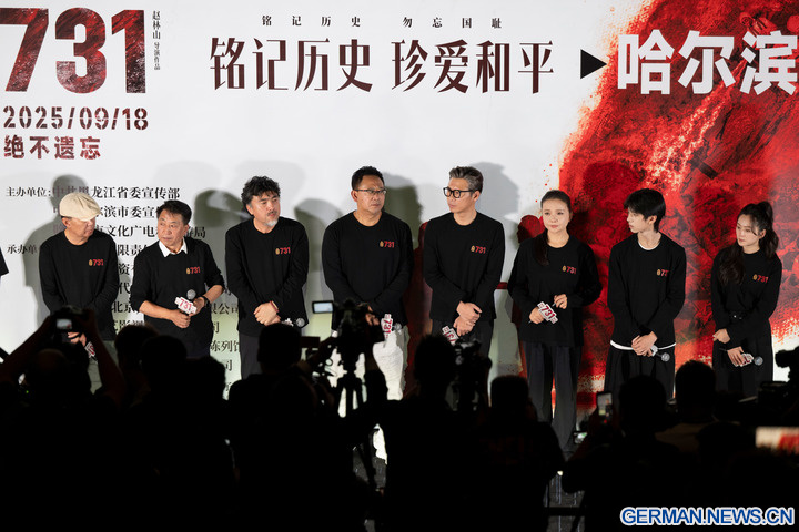 Das Foto zeigt Mitglieder der Filmcrew des Films „Evil Unbound“ bei der Weltpremiere in Harbin in der chinesischen Provinz Heilongjiang im Nordosten Chinas, 17. September 2025. (Xinhua/Zhang Tao)