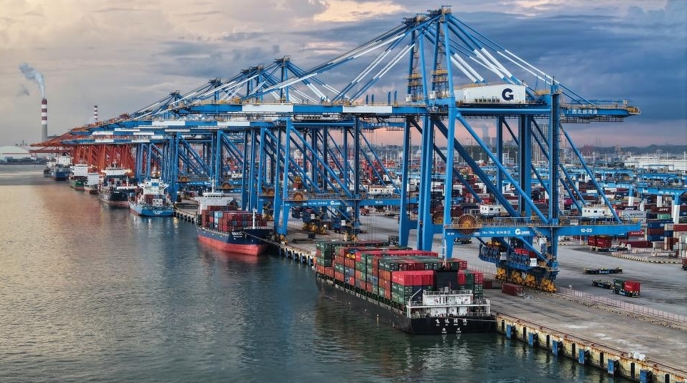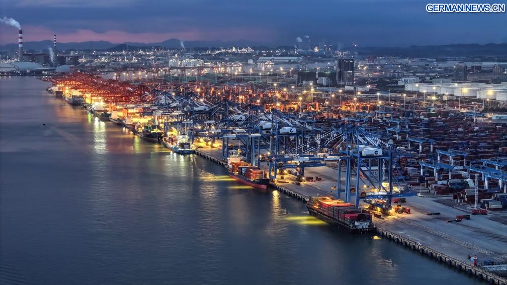 Das am 16. September 2025 aufgenommene Drohnenfoto zeigt eine Ansicht des Hafens von Qinzhou in der Stadt Qinzhou im südchinesischen Autonomen Gebiet Guangxi der Zhuang-Nationalität. Bis August 2025 hat der Neue Internationale Land-See-Handelskorridor seine Reichweite auf 577 Häfen in 127 Ländern und Regionen ausgeweitet und mehr als 1.316 Produktkategorien abgewickelt. (Quelle: Xinhua/Zhang Ailin)