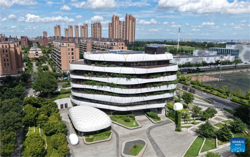 Dieses am 29. Juli 2025 aufgenommene Drohnenfoto zeigt das Passivhaus-Technologiezentrum im chinesisch-deutschen Ökopark in Qingdao in der ostchinesischen Provinz Shandong. (Xinhua/Li Ziheng)