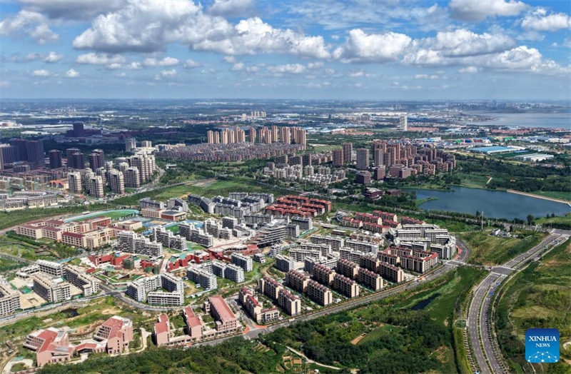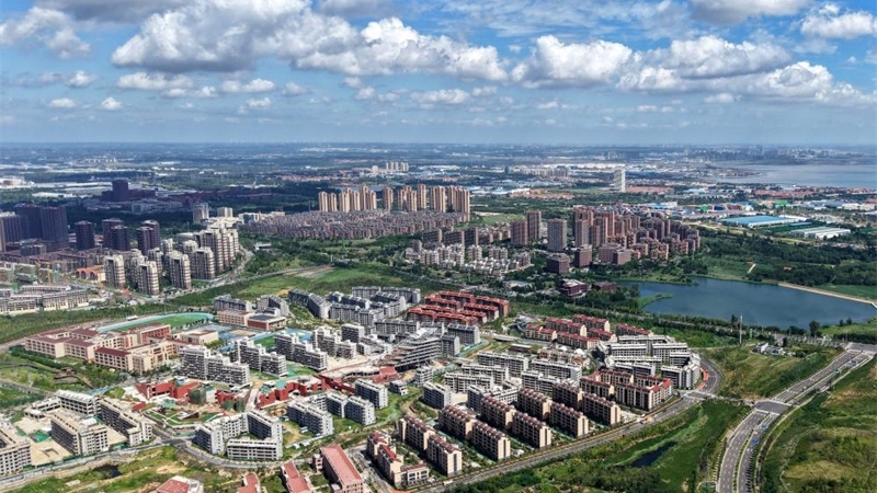 Diese am 29. Juli 2025 aufgenommene Drohnenaufnahme zeigt eine Ansicht des chinesisch-deutschen Ökoparks in Qingdao in der ostchinesischen Provinz Shandong. (Xinhua/Li Ziheng)