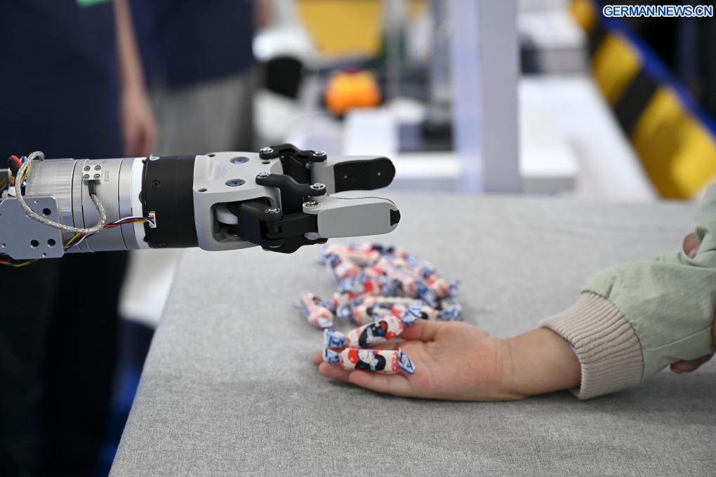 Ein Roboter legt einem Kind Süßigkeiten in die Hand auf der World Manufacturing Convention (WMC) 2025 in Hefei in der ostchinesischen Provinz Anhui, 20. September 2025. Unter dem Motto „Intelligente Fertigung für eine bessere Zukunft“ wurde am Samstag die WMC 2025 hier eröffnet. (Quelle: Xinhua/Huang Bohan)