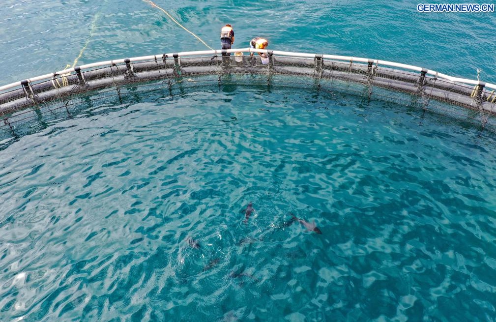 Dank technologischer Durchbrüche hat das Fischereiforschungsinstitut der Chinesischen Akademie für Fischereiwissenschaften im Südchinesischen Meer in Lingshui eine Offshore-Zuchtstation für Gelbflossenthunfische eingerichtet, in der es gelungen ist, Gelbflossenthunfische künstlich laichen zu lassen und deren Eier auszubrüten. (Quelle: Xinhua/Guo Cheng)