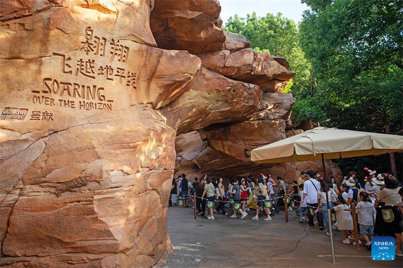 Touristen warten am 19. September 2025 in Shanghai, Ostchina, in der Schlange vor der berühmten Attraktion „Soaring Over the Horizon“ im Shanghai Disney Resort. (Xinhua)