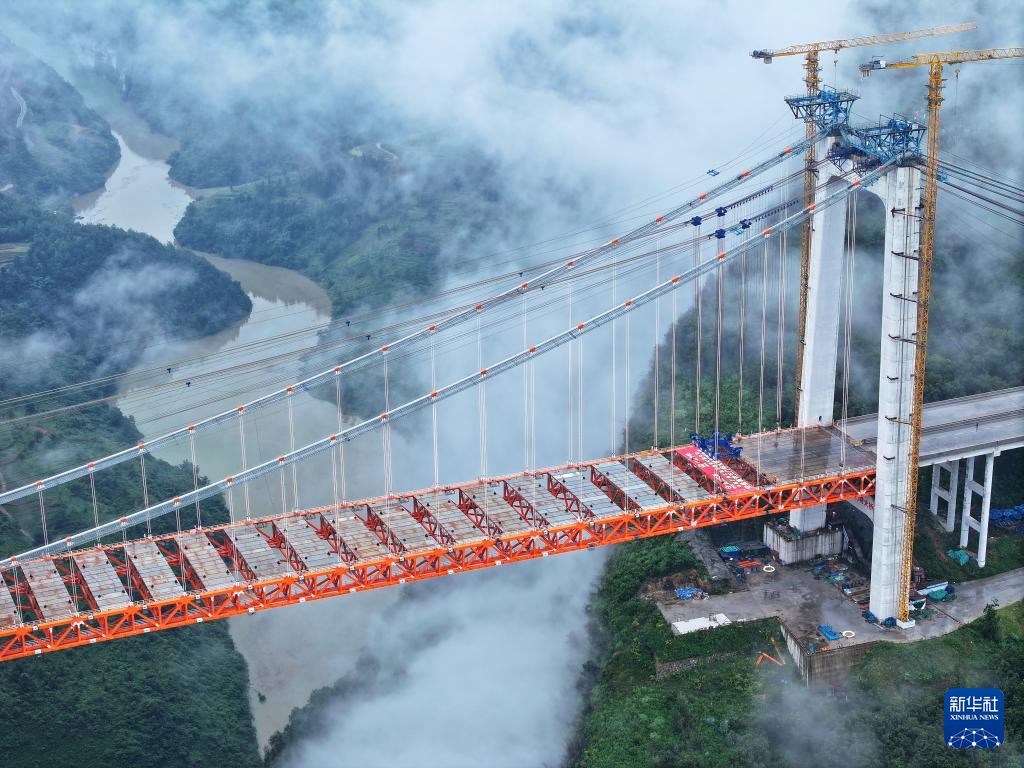 Eine am 23. September 2025 aufgenommene Drohnenaufnahme zeigt die im Bau befindliche Tianmen-Brücke in der südwestchinesischen Provinz Guizhou. (Xinhua/Liu Xu)
