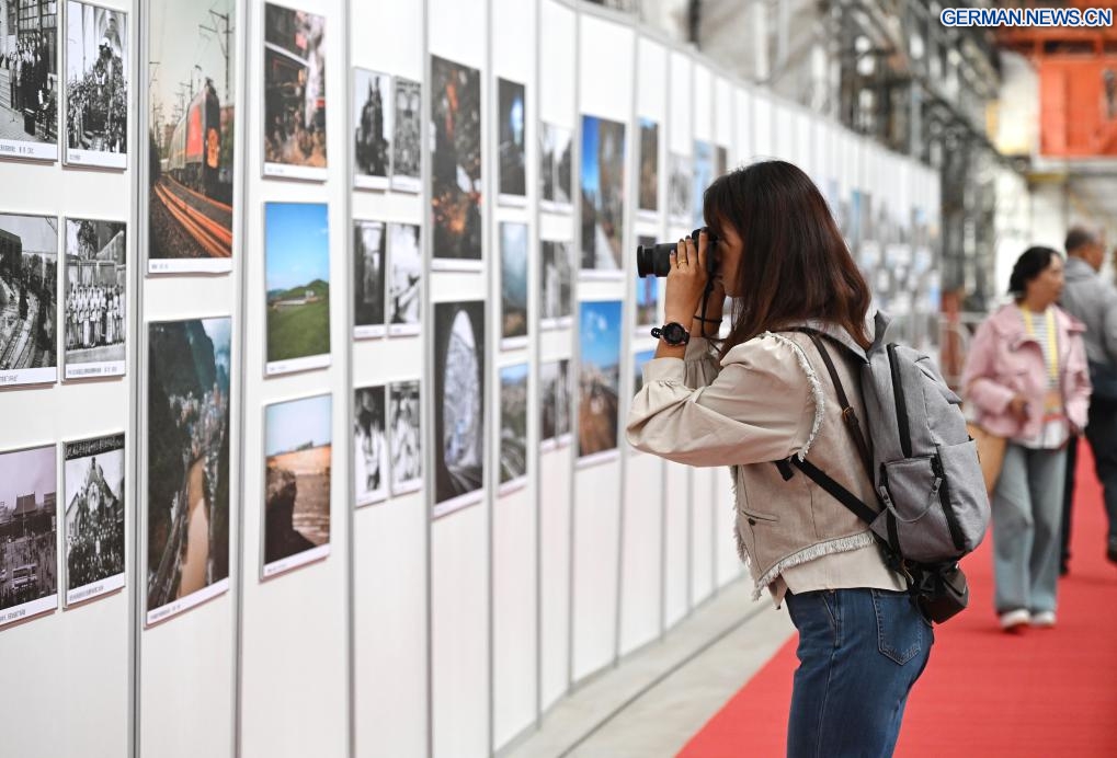Eine Besucherin fotografiert ein Bild bei einer Eisenbahn-Fotoausstellung während einer Messe zum Thema chinesische Eisenbahnkultur in Chinas Hauptstadt Beijing, 27. September 2025. Eine Ausstellung mit einer Sammlung von Exponaten zur chinesischen Eisenbahnkultur wurde hier am Samstag eröffnet und zeigt die Entwicklung und Errungenschaften der chinesischen Eisenbahn. (Quelle: Xinhua/Li He)