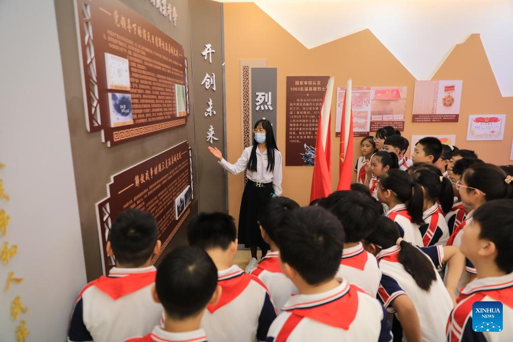 Schülerinnen und Schüler lernen auf einem Märtyrerfriedhof im Kreis Wenxian in der zentralchinesischen Provinz Henan etwas über die Heldentaten der Märtyrer. (Foto vom 30. September 2025, Xinhua)