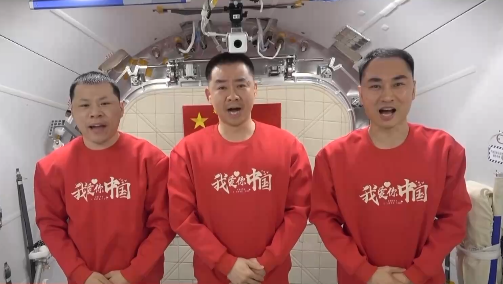 Chen Dong, Chen Zhongrui und Wang Jie trugen rote Oberteile mit den Aufschriften „Das Mutterland ist das Licht, das alles erleuchtet“ und „Ich liebe Dich, China!“ als Zeichen ihrer Liebe und Verbundenheit zu ihrem Heimatland, selbst in den Weiten des Alls.