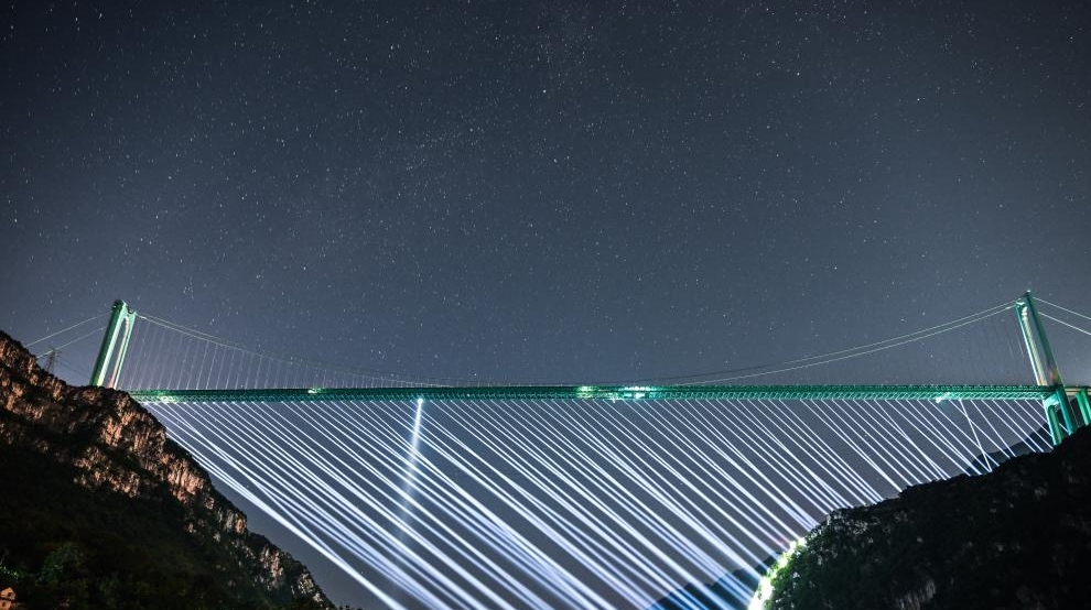 Das Foto zeigt die Huajiang-Grand-Canyon-Brücke unter dem Sternenhimmel in der südwestchinesischen Provinz Guizhou. Diese Brücke, die sich 625 Meter über dem Beipan-Fluss in der bergigen Landschaft von Guizhou erhebt, ist die höchste Brücke der Welt. (11. Oktober 2025, Xinhua)