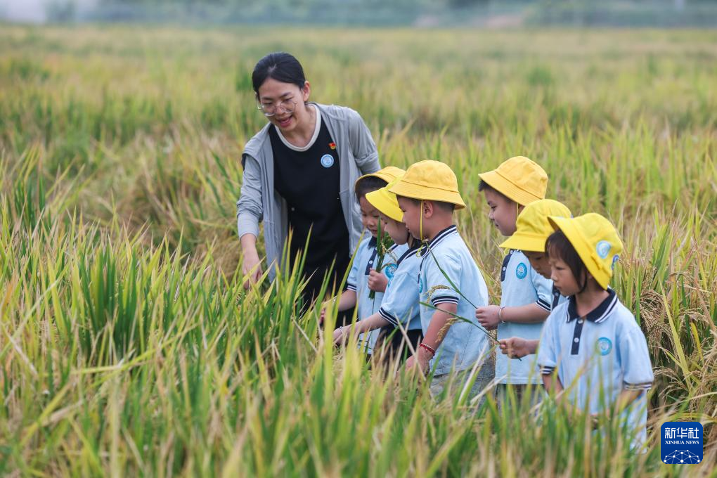 Auf einem Reisfeld bringt eine Lehrerin Kindergartenkindern aus der Stadt Huzhou der nordchinesischen Provinz Zhejiang alles Wichtige über Reis bei. (Foto vom 14. Oktober 2025, Xu Yi/Xinhua)