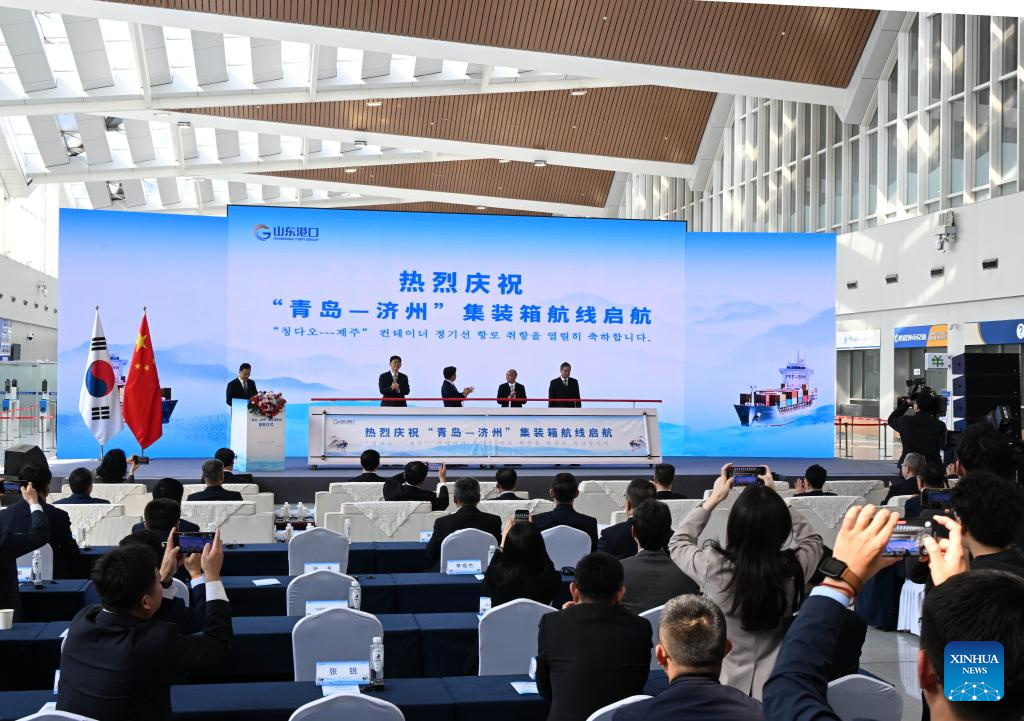 Eröffnungszeremonie für die neue Container-Schiffsverbindung zwischen Qingdao und Jeju im Internationalen Kreuzfahrtterminal der Hafenstadt. (Foto vom 16. Oktober 2025, Xinhua/Li Ziheng)